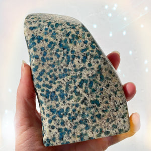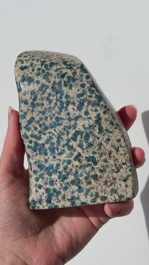 ENERGY: A high vibrational stone composed of Granite and Azurite - stimulates the third eye and helps us seek our universal truths in addition to keeping us grounded. Promotes harmony with ourselves and others by opening the throat chakra.