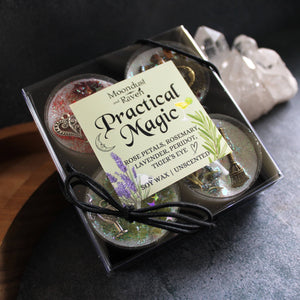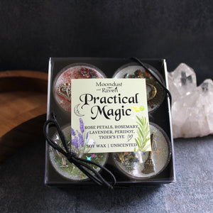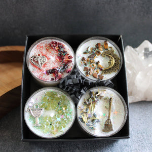 Our Practical Magic tealight candles are decorated with charms, herbs, and crystals, including a heart, broom, margarita glass, moon, rose petals, lavender, rosemary, tiger's eye, and peridot.