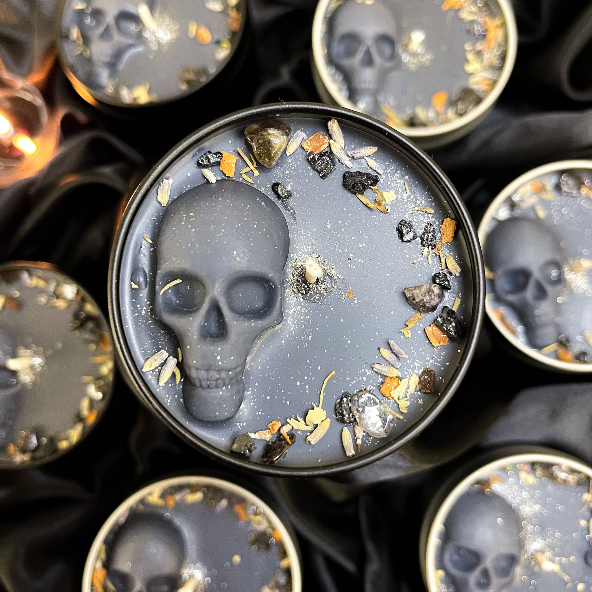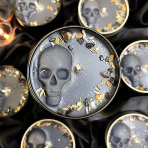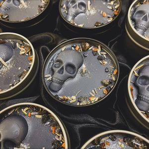 It has a black base and is topped with a black skull wax embed, organic locally sourced corresponding dried herbs, ethically sourced fair trade Quartz crystal chips, and biodegradable glitter. It is placed in a black tin vessel with a matching black lid.