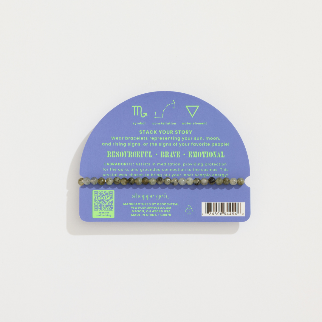 Style Details: 4mm labradorite beads, one 18k gold plated stainless steel zodiac sign bead on elastic band