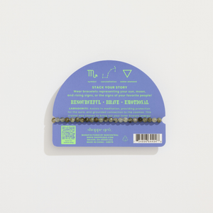 Mini Zodiac Bracelets with 4mm beads are perfect for stacking! Bracelet stacks can represent the main signs of their zodiac chart (sun, moon, and rising signs) or the zodiac signs of their favorite people! The backer card features the birth date range of the sign and a QR code linking to bonus digital content.