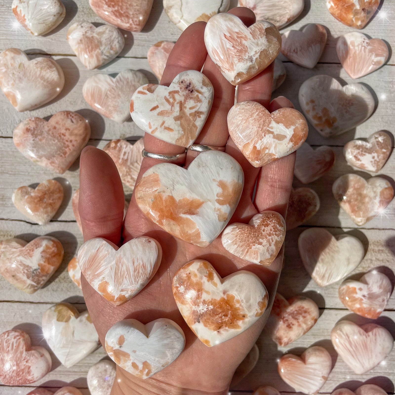 Pink Scolecite resembles sunrays coming through billowy, white clouds. Its peach crystal hues cut through thick white stone. Pink Scolecite’s power echoes this physical nature; the divine finding its way to your mind. A mix of Scolecite and Stilbite, this unique stone brings spiritual connection to the third eye, crown, and heart chakras. Truth, wisdom, and ancient knowledge dispel your fearful ego to give you clarity and calm. Through the heart, Pink Scolecite expands love and acceptance of what we cannot see (spiritual elements). Pink Scolecite softens your fear of the future and reminds you that the heart can guide you to peace, awareness, and knowledge locked out by the scrutinizing mind.