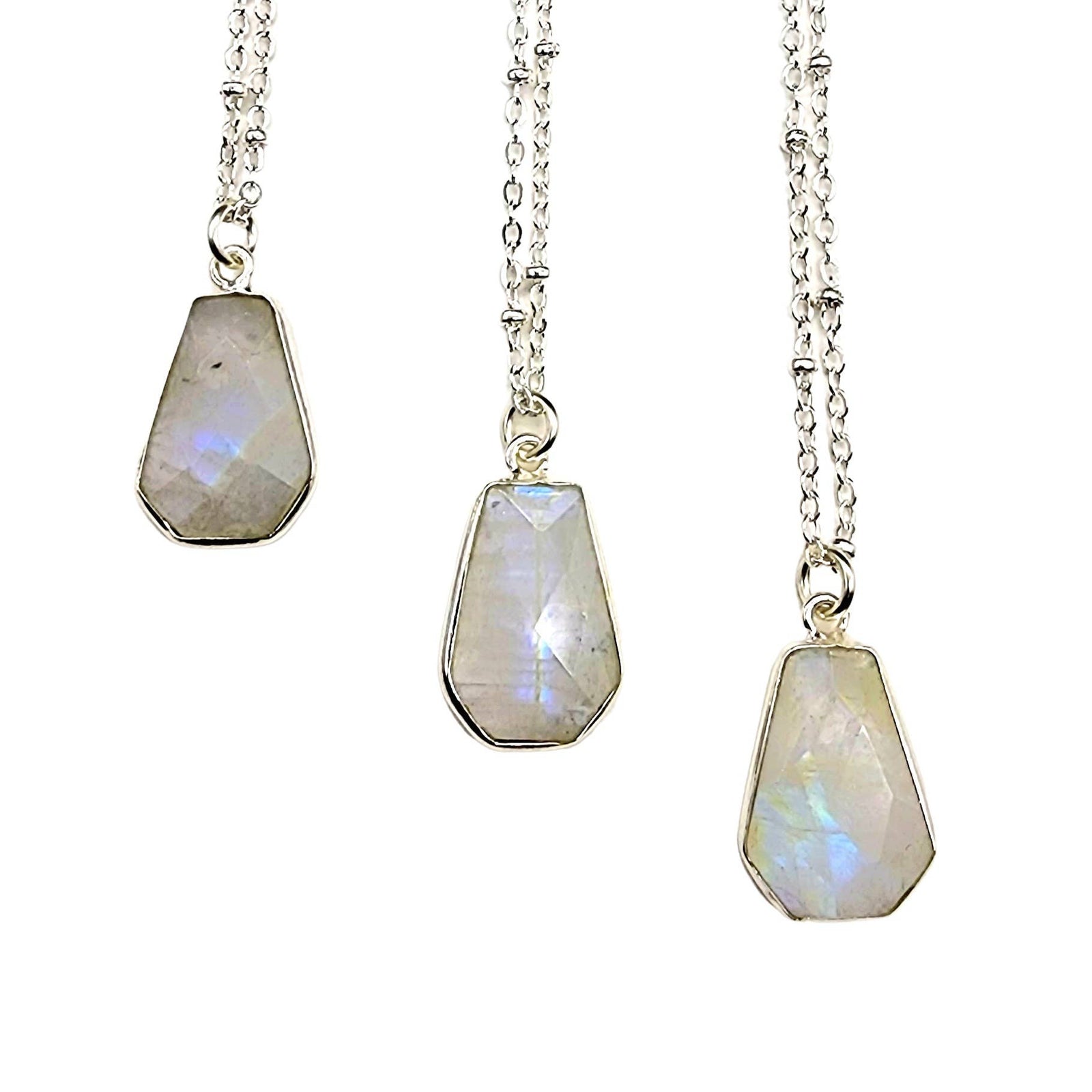 Rainbow Moonstone is a member of the feldspar family, more specifically it’s a plagioclase feldspar, and it’s also considered to be the white variety of Labradorite. Labradorite and Rainbow Moonstone share the characteristic of Labradorescence, which is a very particular play of light off the surface of these crystals. Ironically, these flashes are predominantly blue when they manifest in Rainbow Moonstone, where Labradorite commonly has a wider variety of colorful flashes. Being a part of the feldspar family means that Rainbow Moonstone is actually closely related to traditional Moonstone in its many varieties, which is also a member of the feldspar family. Most Moonstone has a play of light known as adularescence, which is a reflection of light on the surface of the stone that can be either blue or white. Another member of the feldspar family is Sunstone, much like its relatives it also has a play of light called aventurescence. This effect resembles golden or rainbow flecks of glitter under the surface of these crystals. Sunstone can often grow very closely together with Moonstone varieties such as Peach Moonstone or Black Moonstone, creating a combination Sunstone Moonstone that has both the notable adularescence of Moonstone and the aventurescence of Sunstone. Even with such a flashy family, Rainbow Moonstone stands out with its stark white color and unique flash patterns that make it distinctly separate from both Labradorite and Moonstone.