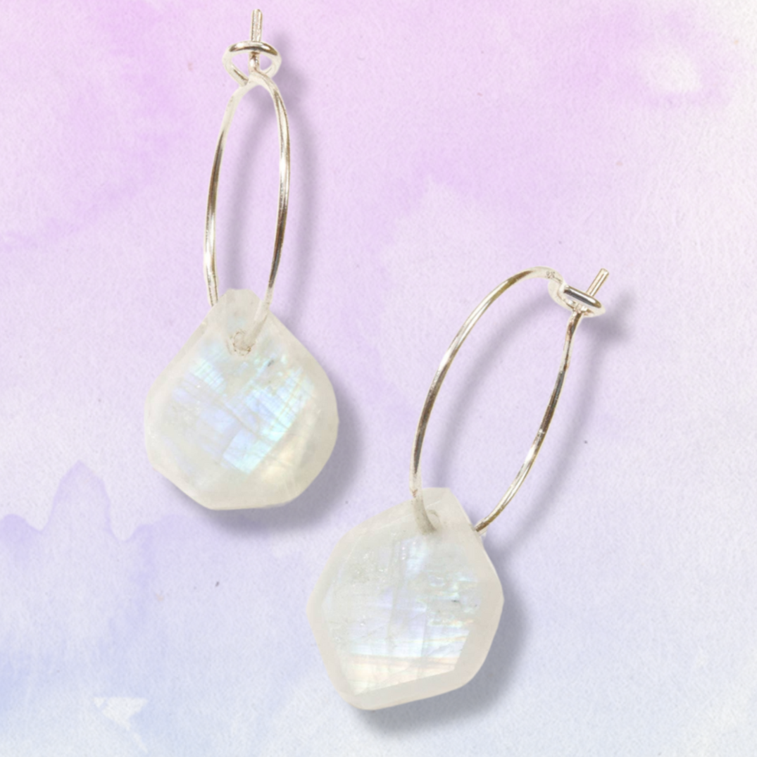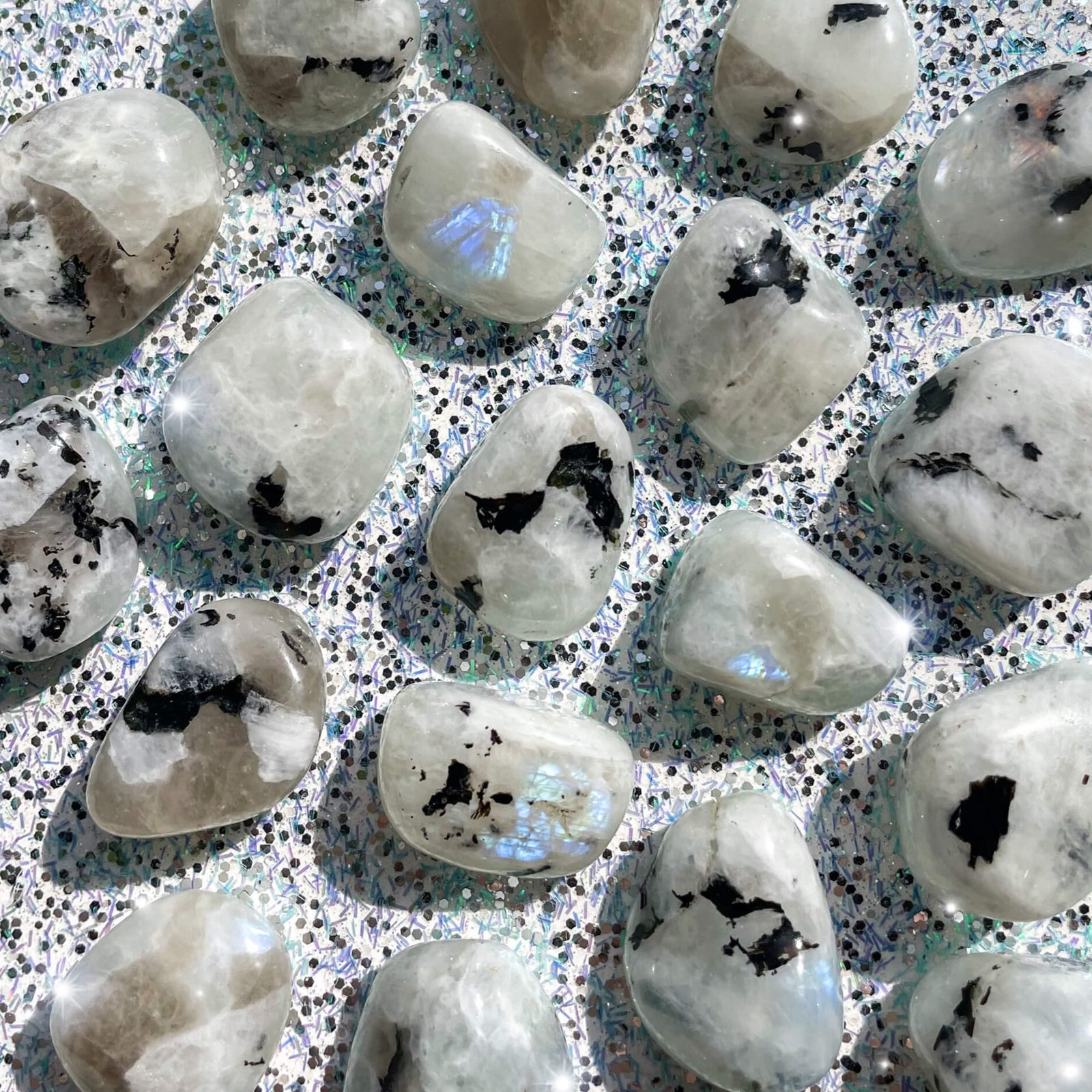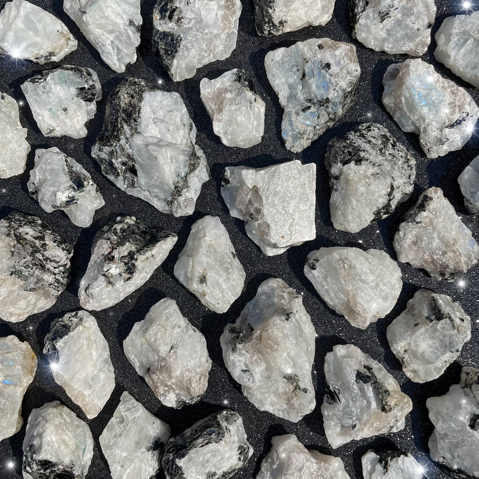 Rainbow Moonstone is a member of the feldspar family, more specifically it’s a plagioclase feldspar, and it’s also considered to be the white variety of Labradorite. Labradorite and Rainbow Moonstone share the characteristic of Labradorescence, which is a very particular play of light off the surface of these crystals. Ironically, these flashes are predominantly blue when they manifest in Rainbow Moonstone, where Labradorite commonly has a wider variety of colorful flashes. Being a part of the feldspar family means that Rainbow Moonstone is actually closely related to traditional Moonstone in its many varieties, which is also a member of the feldspar family. Most Moonstone has a play of light known as adularescence, which is a reflection of light on the surface of the stone that can be either blue or white. Another member of the feldspar family is Sunstone, much like its relatives it also has a play of light called aventurescence. This effect resembles golden or rainbow flecks of glitter under the surface of these crystals. Sunstone can often grow very closely together with Moonstone varieties such as Peach Moonstone or Black Moonstone, creating a combination Sunstone Moonstone that has both the notable adularescence of Moonstone and the aventurescence of Sunstone. Even with such a flashy family, Rainbow Moonstone stands out with its stark white color and unique flash patterns that make it distinctly separate from both Labradorite and Moonstone.