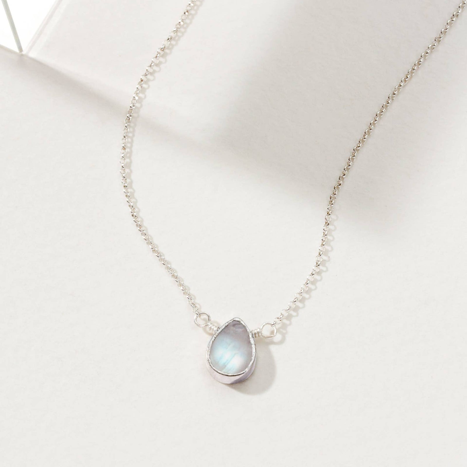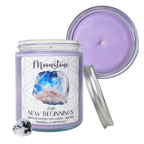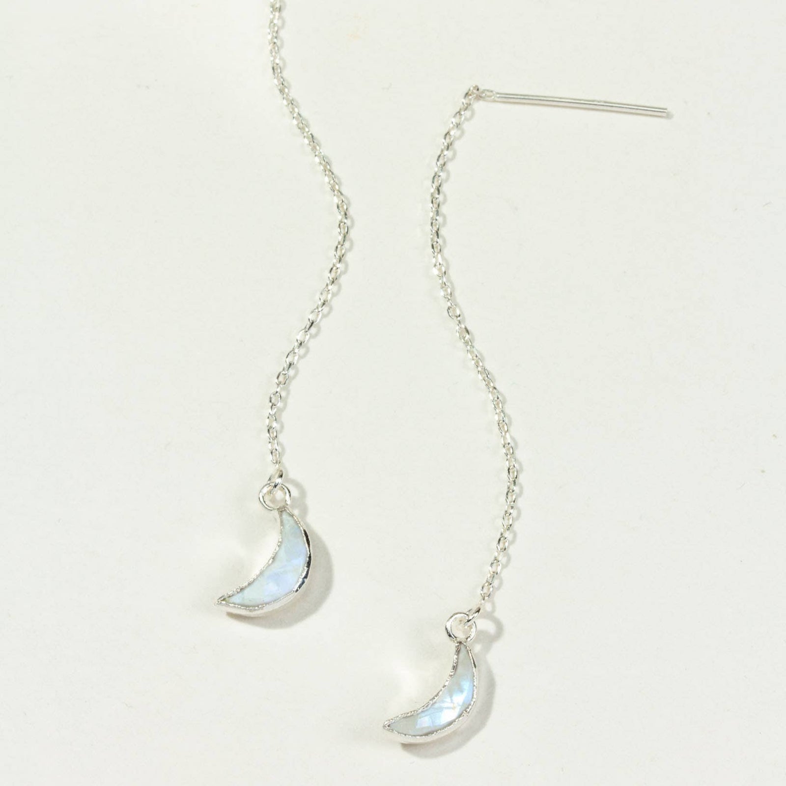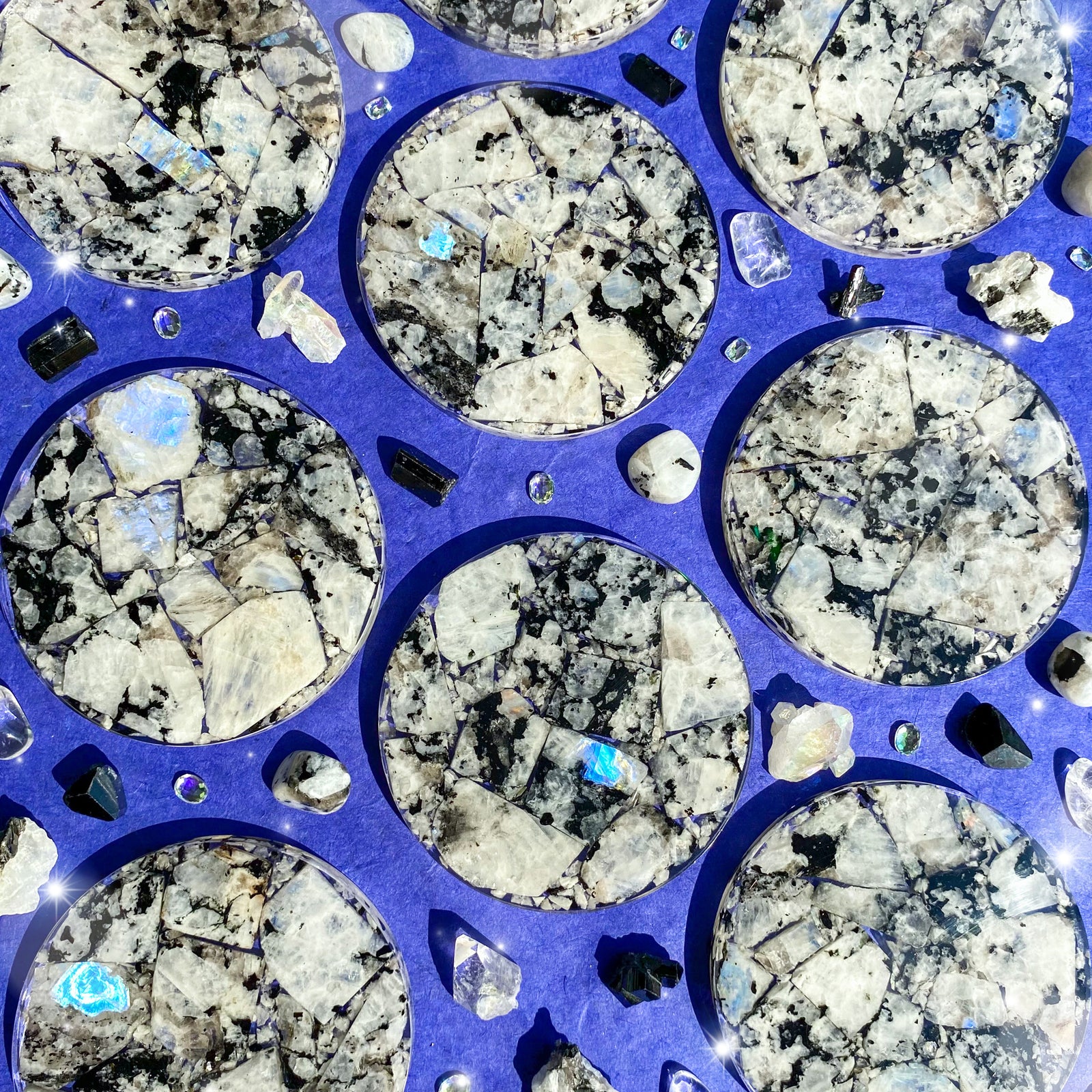 Rainbow Moonstone is a member of the feldspar family, more specifically it’s a plagioclase feldspar, and it’s also considered to be the white variety of Labradorite. Labradorite and Rainbow Moonstone share the characteristic of Labradorescence, which is a very particular play of light off the surface of these crystals. Ironically, these flashes are predominantly blue when they manifest in Rainbow Moonstone, where Labradorite commonly has a wider variety of colorful flashes. Being a part of the feldspar family means that Rainbow Moonstone is actually closely related to traditional Moonstone in its many varieties, which is also a member of the feldspar family. Most Moonstone has a play of light known as adularescence, which is a reflection of light on the surface of the stone that can be either blue or white. Another member of the feldspar family is Sunstone, much like its relatives it also has a play of light called aventurescence. This effect resembles golden or rainbow flecks of glitter under the surface of these crystals. Sunstone can often grow very closely together with Moonstone varieties such as Peach Moonstone or Black Moonstone, creating a combination Sunstone Moonstone that has both the notable adularescence of Moonstone and the aventurescence of Sunstone. Even with such a flashy family, Rainbow Moonstone stands out with its stark white color and unique flash patterns that make it distinctly separate from both Labradorite and Moonstone.