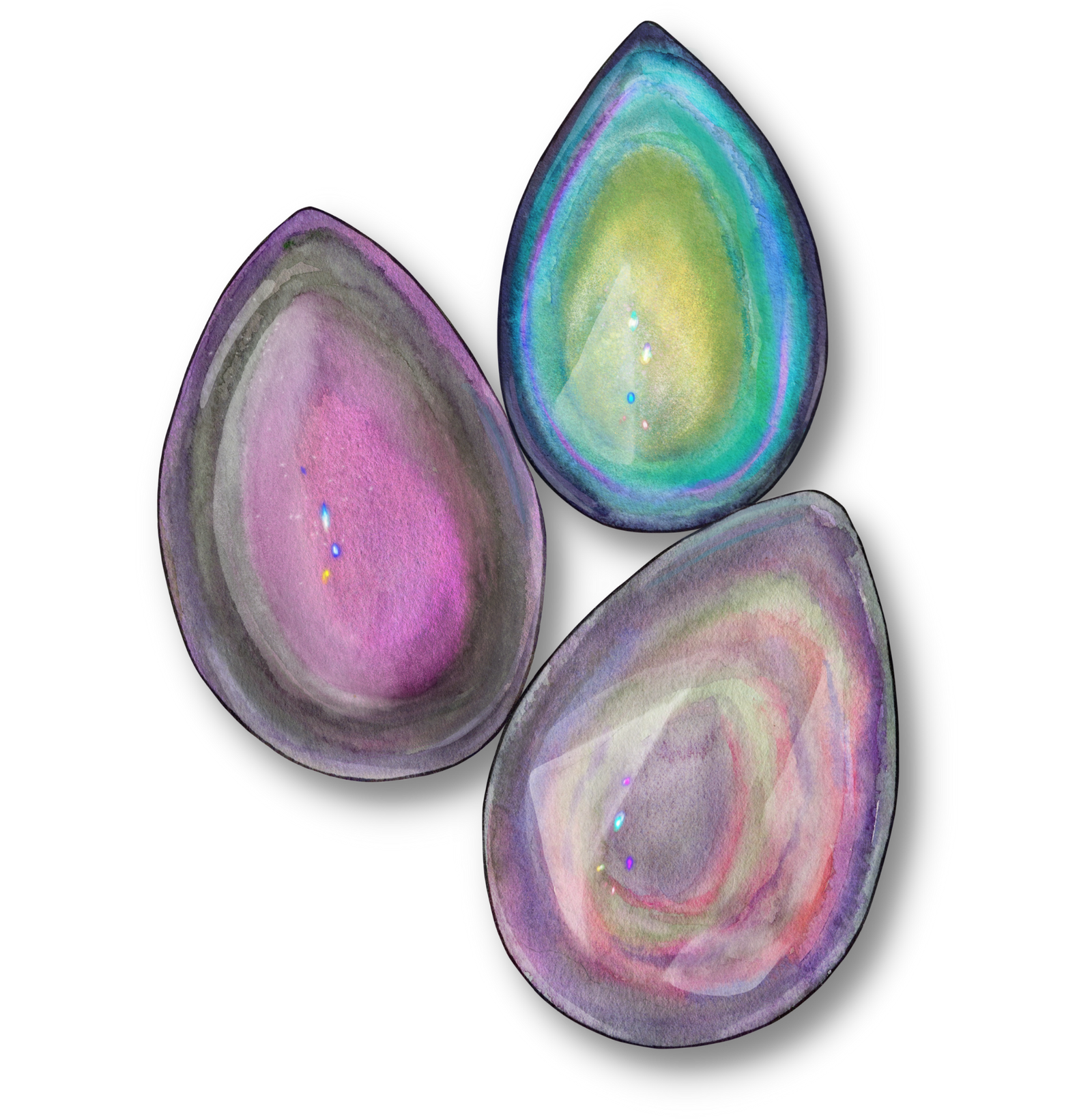 This multicolored stone forms when lava cools at different times. Each layer of purple and green is lava frozen in time, resulting in rainbow bands. Rainbow Obsidian also has an iridescent shine from Magnetite nanoparticles. The nanoparticles are cooled within the lava and radiate a shimmery effect when light hits it.