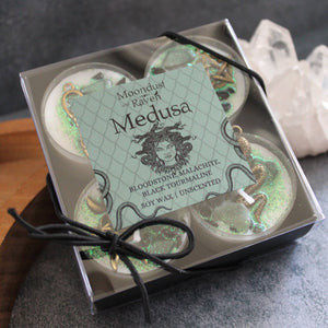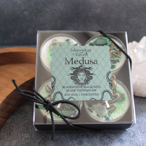 The Medusa tealight candles are decorated with bronze charms (snake, triple moon, goddess, and pentacle), bloodstone, malachite, and black tourmaline.