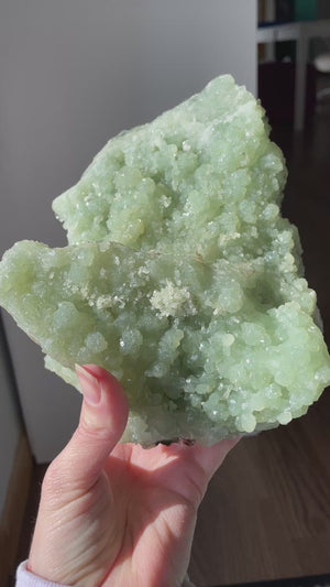 ENERGY: This soft green stone is like a new bud in early spring. As winter’s cold endures, the bud remains to wait for the sun’s embrace. No matter the weather, the bud exudes a quiet confidence through trust and acceptance. Prehnite hones this equal energy of inner strength, patience, and humble fortitude. Opening the solar plexus and heart chakra, Prehnite is a unique healer as this combination of chakras is rare. Its unusual energy generates a connection between self love and self confidence. In all things you do, it will also feed your heart’s desire. All of your guidance can be found within instead of receiving assurance from others. It is the heart that informs the solar plexus with Prehnite. In effect, soul-nourishing inspiration is embraced openly with a wanting heart.