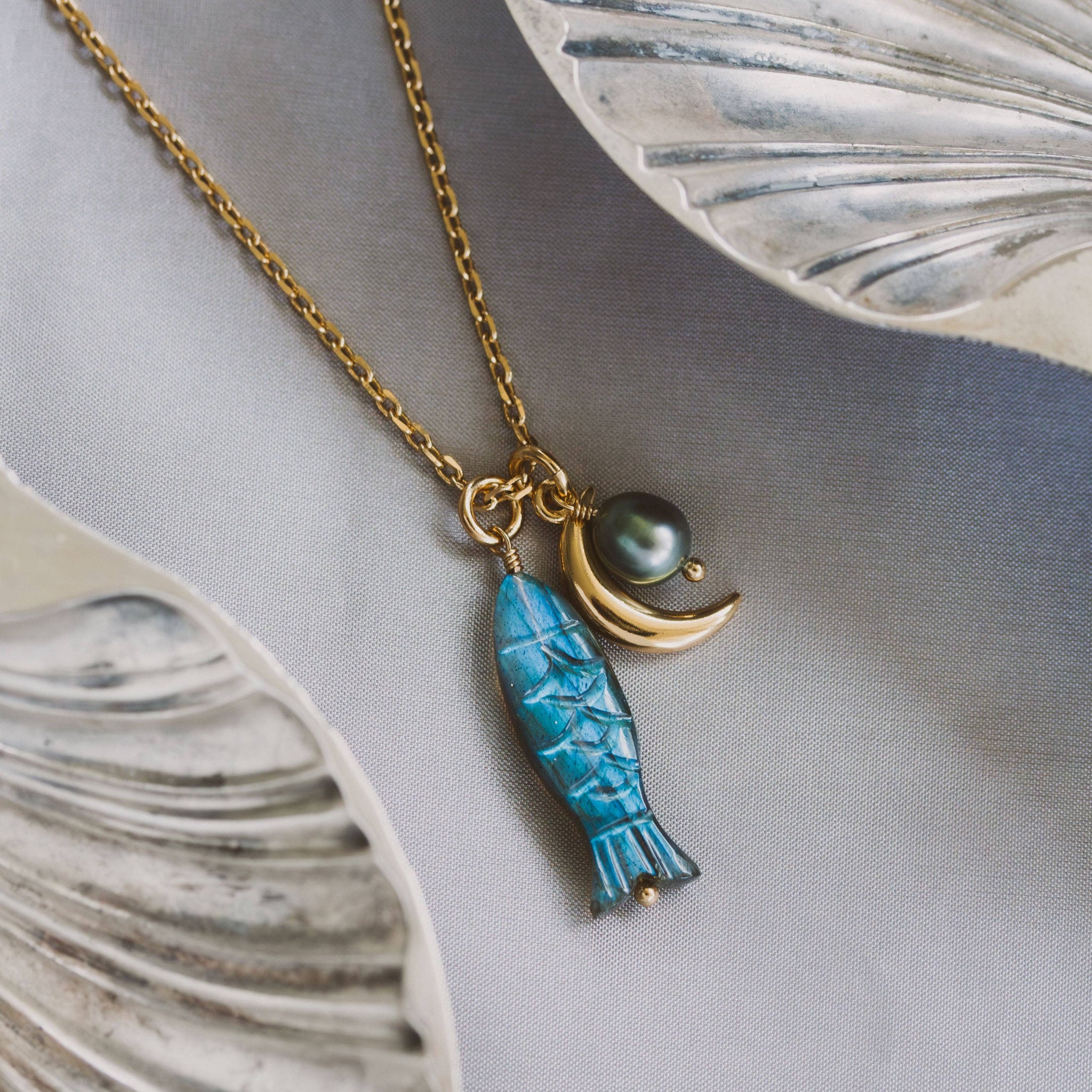 Inspired by the charm of small, flavorful tapas dishes and the laid-back beauty of the Iberian coast, this necklace features a trio of coordinated elements: a sardine-shaped charm carved from genuine labradorite, a luminous freshwater pearl, and our signature crescent moon. The longer chain adds movement and makes it ideal for layering, offering multiple styling opportunities for customers who love a personalized look. This piece works beautifully as a standalone statement or merchandised alongside the matching Tapas & Tides earrings for a cohesive, vacation-ready capsule.